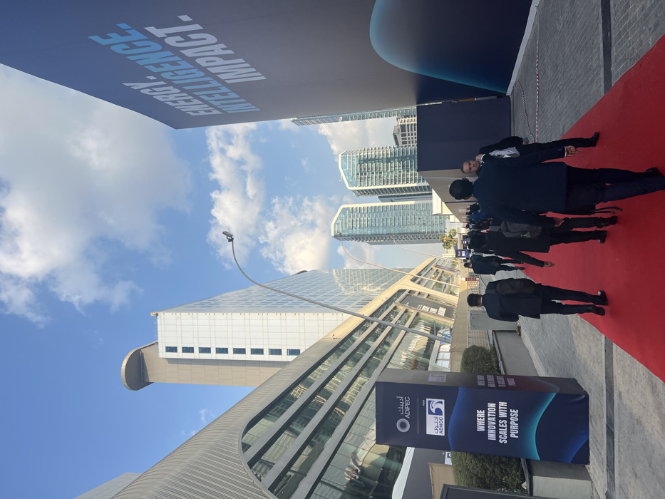 The image displays an outdoor pathway at the Abu Dhabi National Exhibition Centre (ADNEC) complex in Abu Dhabi, United Arab Emirates. Approximately ten to fifteen individuals, predominantly adult males in business attire, walk away from the viewer along a red carpet laid over a paved surface. On the left side of the pathway, a modern building with a curvilinear architectural design and reflective glass facades is prominent. Behind it, a tall, white high-rise building with a distinctive circular structure on its roof is visible. A dark blue vertical banner promoting "ADIPEC" and "ADNOC" with the tagline "WHERE INNOVATION SCALES WITH PURPOSE" stands adjacent to the path. On the right side, a large, dark-colored billboard with the text "ENERGY. INTELLIGENCE. IMPACT." in white and blue lettering is situated. Beyond this billboard, several modern glass-faced high-rise buildings form part of the urban skyline. A street light pole with a curved arm is visible in the mid-ground. The scene is illuminated by natural sunlight under a blue sky with scattered white clouds.
