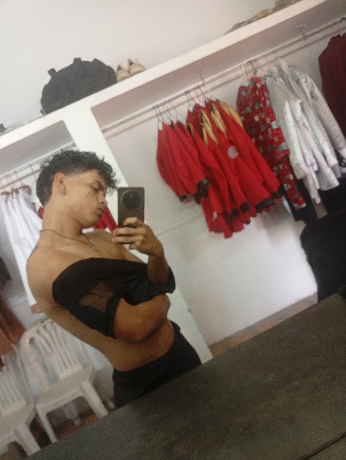 young male individual, shirtless and wearing dark bottoms, taking a mirror selfie in an indoor room located in Pedro González, Venezuela. He is holding a dark smartphone in his right hand, positioning it to capture his reflection. A black garment is draped across his left arm and shoulder, and a necklace with a dark pendant is visible around his neck. The room's background, reflected in the mirror, features white walls. On the left, two white plastic chairs are present. Along the wall, multiple clothing racks display various garments, prominently featuring a collection of red clothing items, some with yellow accents, alongside white and patterned apparel. A white shelf above the clothing racks holds a black backpack and a pair of light-colored shoes. The lower foreground of the image consists of the dark, reflective surface of the object serving as the mirror.