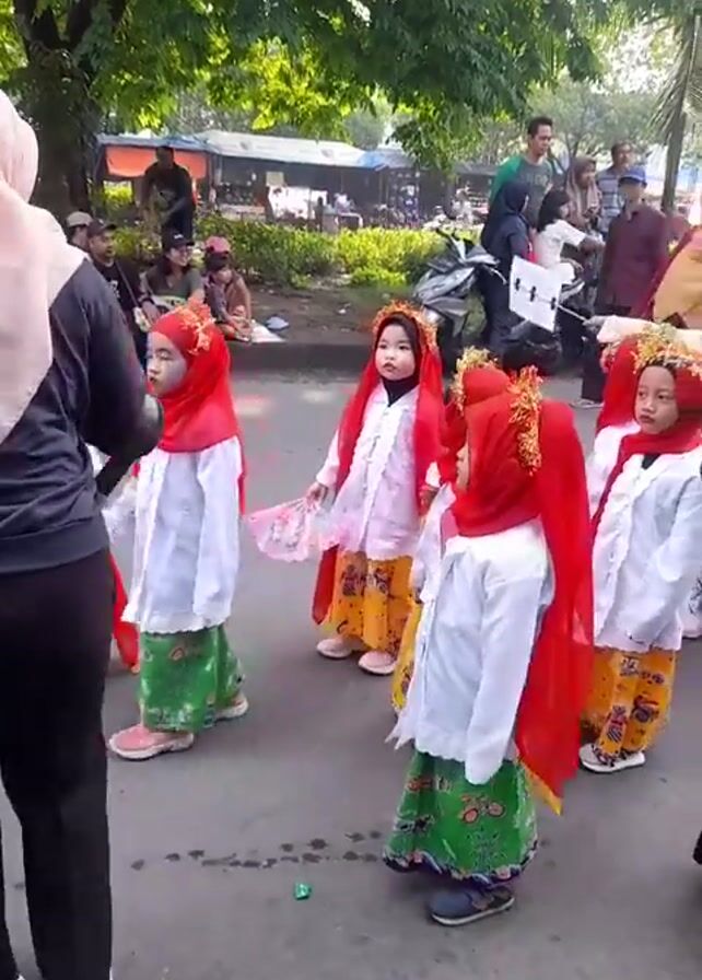 group of young children in a parade. The children are dressed in traditional clothing, including white shirts, brightly colored pants, and red headscarves. Some of the children are carrying small fans. Adults, some wearing hijabs, accompany the children, guiding and watching over them. The parade is taking place on an asphalt road in a park or public area, as indicated by the presence of trees, stalls, and other people in the background. Some observers are sitting or standing, watching the parade. A scooter is parked nearby. The overall atmosphere appears festive.