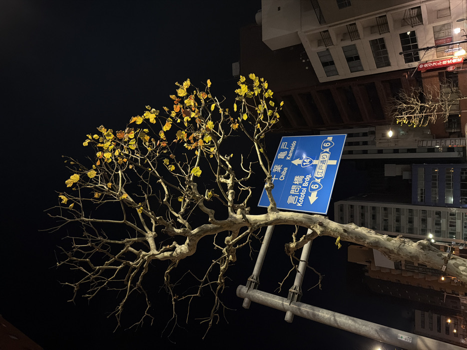 The image depicts a tree with bare branches and yellow leaves juxtaposed against a dark night sky. A blue Japanese road sign is prominently displayed, bearing directions to Chiba, Kameido, and Kototoi Bridge. Text on the sign indicates routes 14 and 6, possibly referring to highway numbers. In the background, buildings are faintly visible, illuminated by streetlights, with Japanese text visible on one of them. The scene is viewed from an unusual angle, with the buildings appearing to be above the tree.