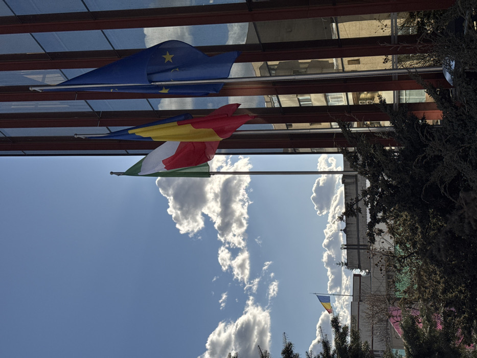 This image depicts an urban exterior scene in Iași, Romania, consistent with the area around the Palas Complex. The setting is a sunny day under a bright blue sky with scattered white cumulus clouds. In the foreground, three flags are displayed on individual poles in front of a modern building. From left to right, these are: the flag of Italy (vertical green, white, red stripes), the flag of Romania (vertical blue, yellow, red stripes), and the flag of the European Union (a blue field with a circle of twelve yellow stars). The flags are gently waving, suggesting a light breeze. The building directly behind the flags features a reflective glass facade with prominent vertical reddish-brown structural elements. Reflections of an older, light-colored, multi-story building are visible on its glass surface. Dark green evergreen shrubs occupy the lower foreground. In the mid-ground, beyond the shrubs, a light-colored building with a sign partially visible as "SPORT" stands with a flat roofline. A smaller Romanian flag is also visible on a pole atop or near this "SPORT" building. The overall scene indicates an institutional or prominent commercial/public area within the city.
