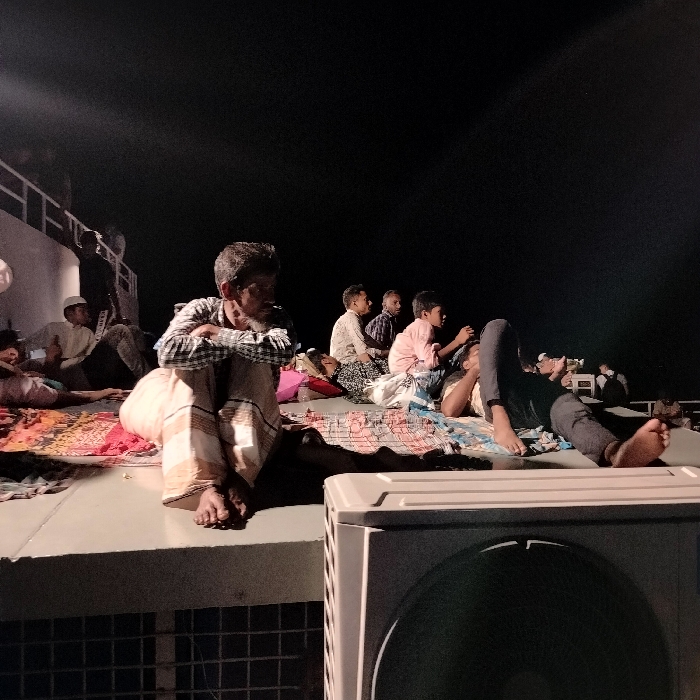 Several people, possibly refugees, are gathered on a boat deck at night. They are lying and sitting on mats. The man in the foreground is in traditional clothing with his arms crossed, looking thoughtful. In the background, there are other figures, some wearing hats, others sitting upright. A large, possibly air conditioning unit, is visible in the bottom right corner. The scene is dark, with only the boat deck appearing illuminated.