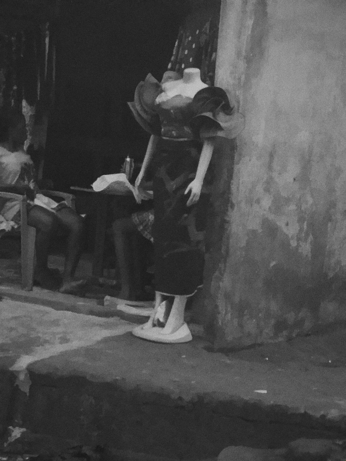 - "This black and white image depicts a street scene in Ukwu-Abwa, Nigeria, centered on a headless mannequin displaying traditional clothing" by FM-2cBFK2, licensed under CC BY 4.0