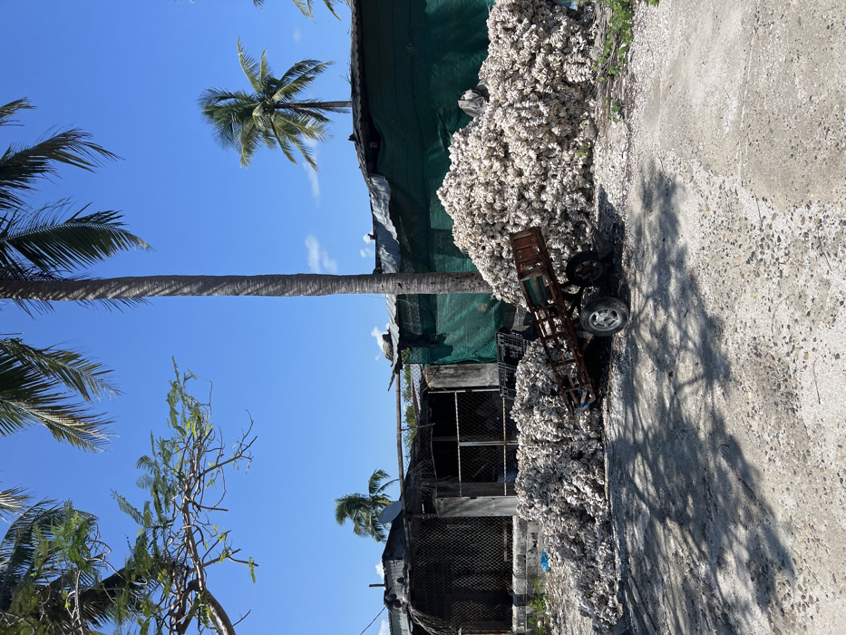 This image captures an outdoor scene in Vĩnh Lương, Vietnam, under a clear blue sky with sparse white clouds. The upper frame is dominated by the green fronds of several tall palm trees, with one prominent trunk vertically bisecting the mid-right. A smaller, broad-leafed tree branch extends into the upper left. In the midground, a collection of dilapidated, single-story structures with corrugated metal roofs is visible. The structure on the left features sections of chain-link fence or mesh as part of its walls, and a small satellite dish is mounted on its roof. The structure on the right is partially covered by dark green netting or tarpaulin. Immense, irregularly shaped piles of countless white objects, consistent with bivalve shells (likely oyster shells), occupy the lower midground, stretching from the left to the right of the frame and reaching heights that obscure the lower sections of the buildings behind them. In front of these shell piles, a two-wheeled utility cart, constructed from rusted metal with a wooden bed, rests on uneven ground, angled slightly with its left wheel elevated. Several dark plastic crates are visible near the cart, partially covered by shells. The foreground consists of a light gray, unpaved or gravelly ground surface with scattered darker pebbles and patches of dirt. Shadows from the overhead trees are cast across this ground, indicating direct sunlight. No individuals are present in the scene.