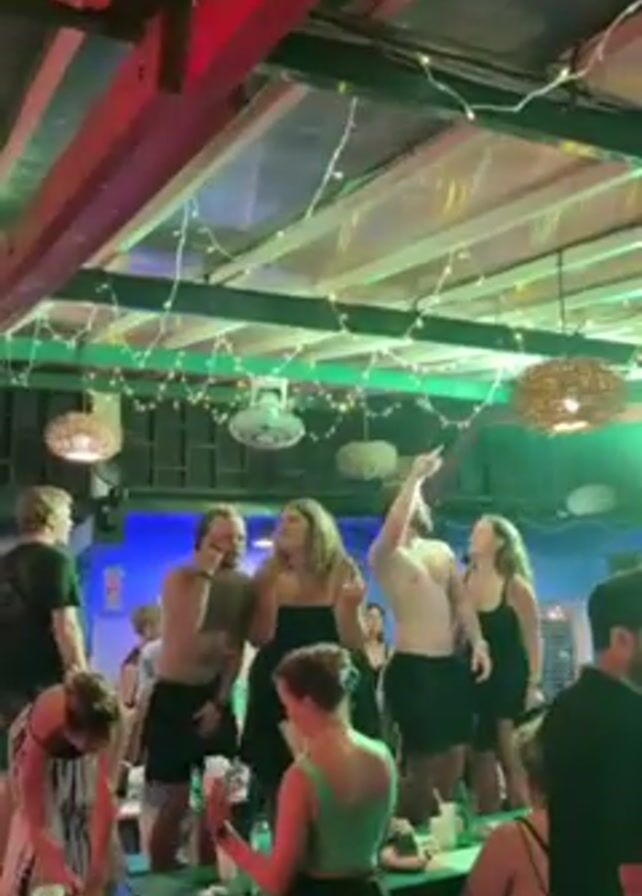 A group of about 10 young adults are seen in what appears to be a bar or restaurant with a covered but open roof space. They are dancing and singing while standing on top of a large table. The men are mostly shirtless while the women wear short dresses. Decorations include strings of small white lights, hanging light fixtures, and colored party lighting that shifts between red, green and blue. Other people are standing around at the tables on the floor. There is a bartender behind a small bar.