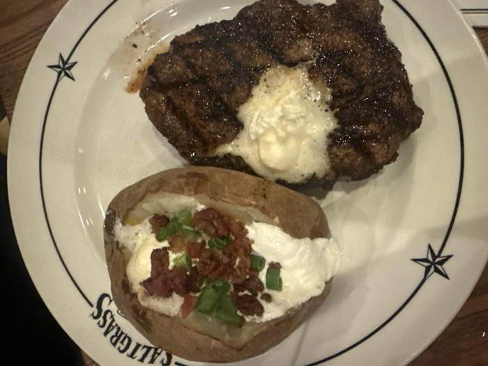 A grilled steak with a melting pat of butter rests on a white plate with a blue trim and decorative stars. Beside the steak, a baked potato is cut open and filled with white cream, chopped bacon, and green onions. The plate includes the text "SALTGRASS" along the rim. The meal is presented on a wooden surface.