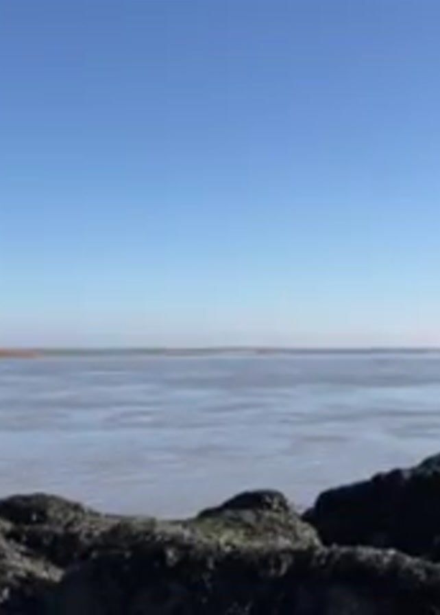The scene shows a coastal view on a bright, clear day with a cloudless blue sky. In the foreground, there are several dark, seaweed-covered rocks. Beyond the rocks is a body of calm, grey-brown water that appears to be a bay or estuary. On the left side of the frame, a tall, red and black navigational marker stands in the water, partially submerged at its base. In the distance, a thin strip of land is visible on the horizon. The overall impression is one of a calm and tranquil seascape.
