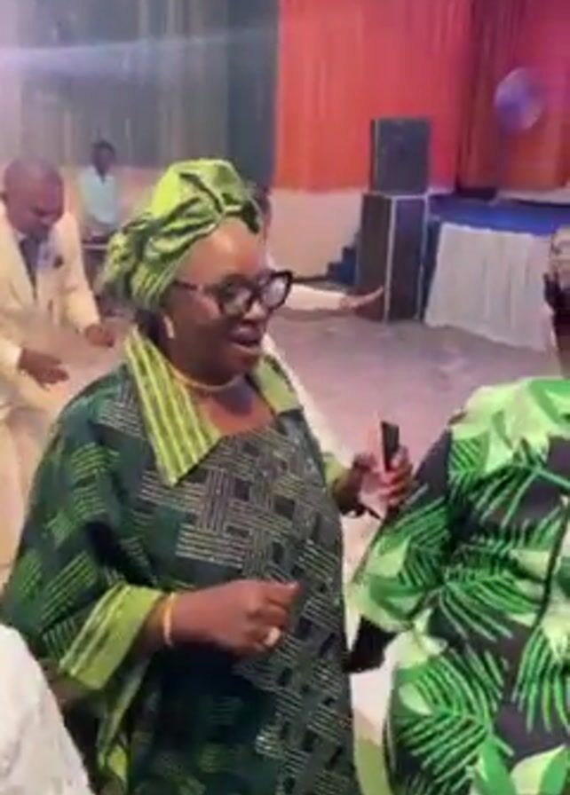 The video depicts a joyous wedding reception in what appears to be a decorated hall. Several people, predominantly women in colorful traditional African attire, are dancing and celebrating. One woman, wearing a green dress and matching headwrap, is prominently featured, dancing with a phone in her hand. Other guests are dressed in a variety of styles, including suits and more traditional garments. The backdrop includes decorated elements and a stage, indicating the wedding setting. The atmosphere is lively with music and dancing.