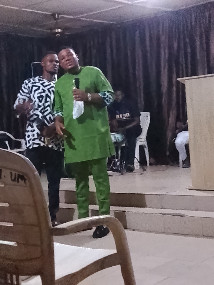 Two men stand on a stage, one in a green suit holding a microphone. The other wears a black and white patterned shirt and black pants. Behind them, a man plays drums. A person is seated on a chair to the far right. The scene is illuminated by overhead lighting, with dark curtains in the background. A wooden pulpit stands to the right. A chair is partially visible in the foreground.