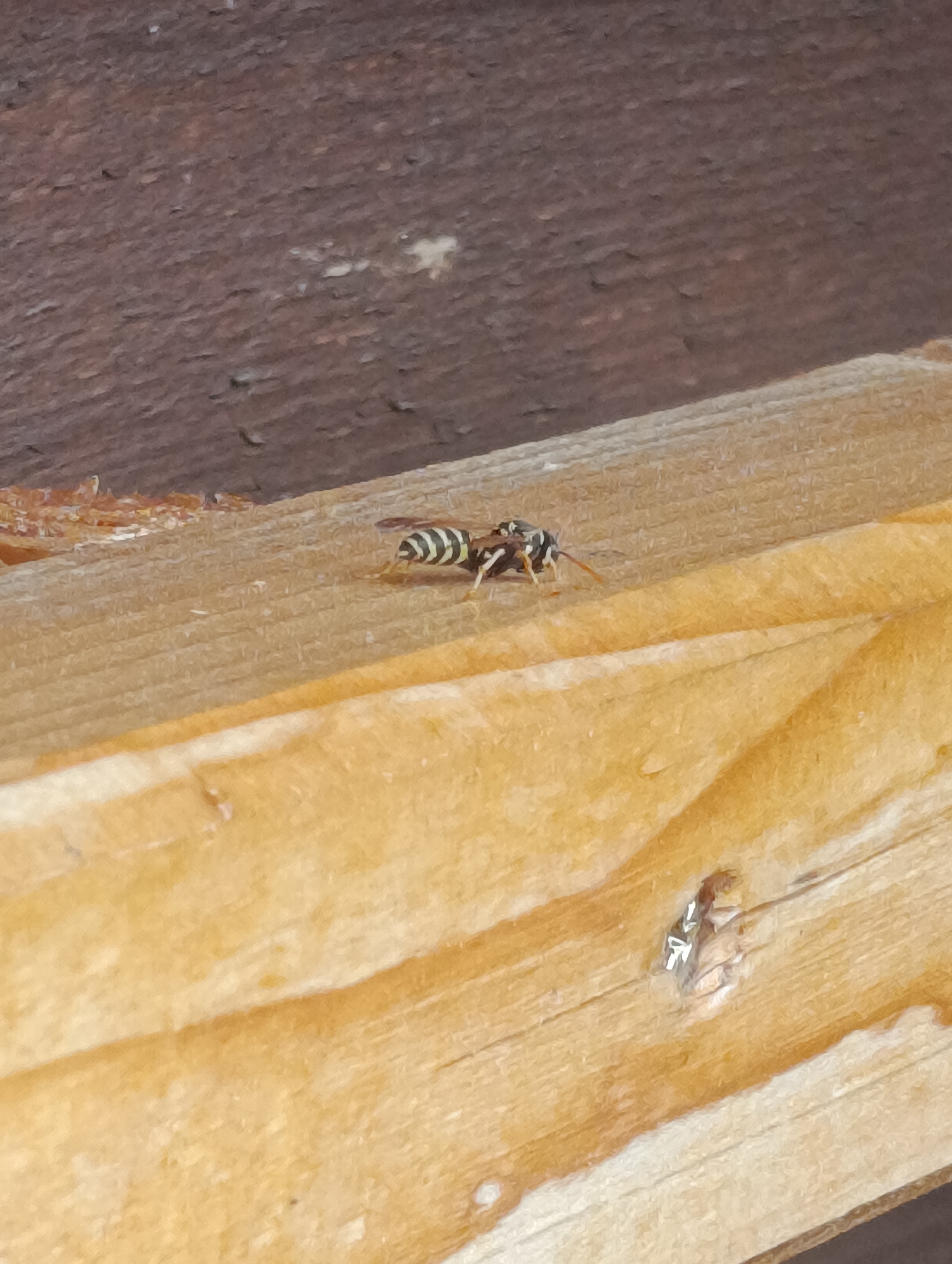A wasp with yellow and black bands is standing on a wooden plank