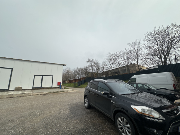 The image displays an outdoor scene in Petrich, Bulgaria, under an overcast sky. In the immediate foreground, a black Ford Kuga SUV is parked on a damp, dark paved surface, angled slightly toward the left. Behind the SUV, a dark-colored hatchback and a white cargo van, identified as a Mercedes-Benz Sprinter, are also parked. To the left, a single-story white building features white paneling and two prominent dark-framed door openings, one single and one double; a red rectangular utility box is affixed to the building's exterior near the double doors. A dark fence separates the foreground from a dense line of bare deciduous trees and various industrial or storage structures in the mid-background. The ground appears damp throughout. No individuals or discernible activities are present.
