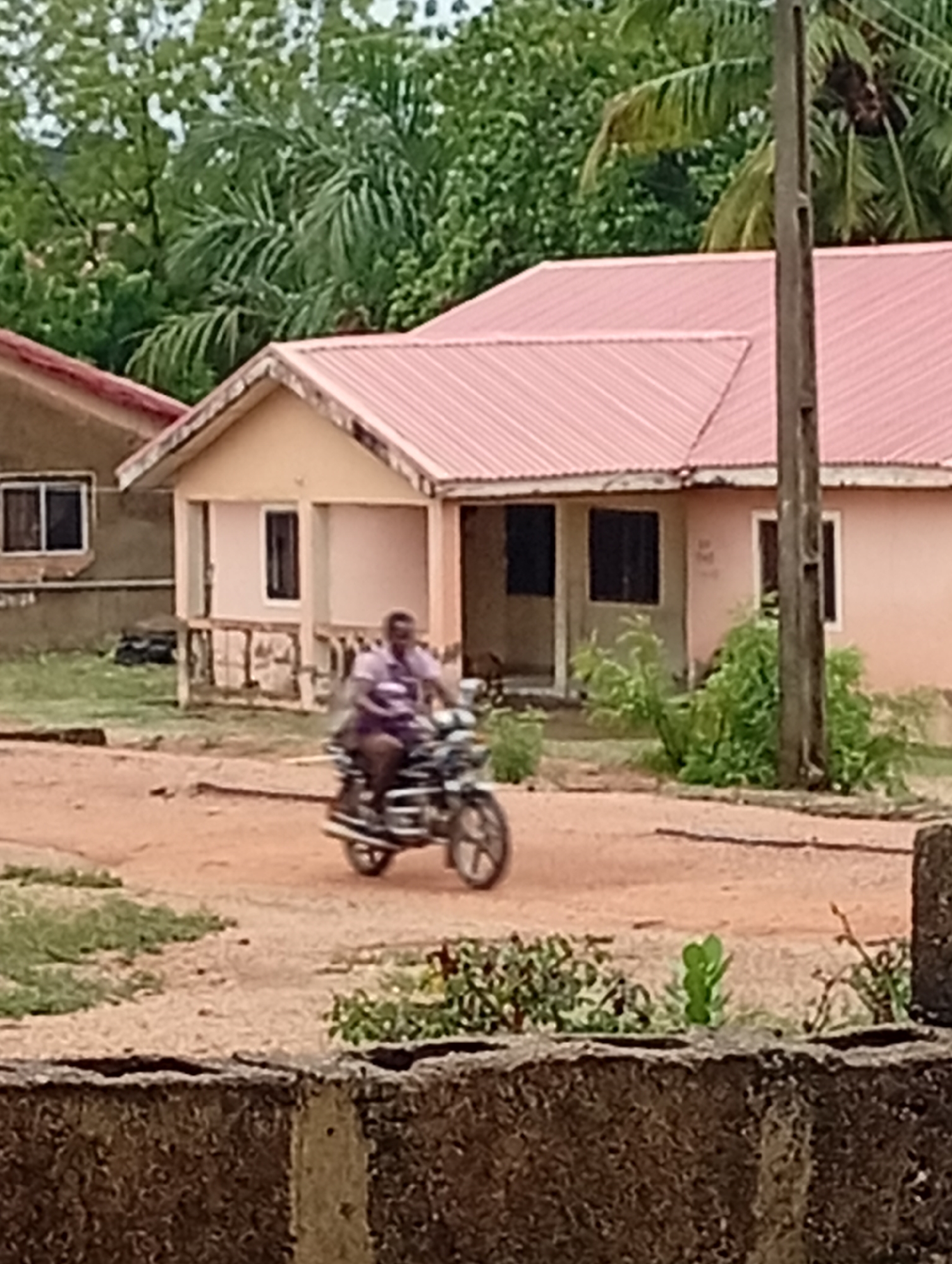 A man is riding a motorcycle on a dirt road in Adankolo, Nigeria. The road is dusty and sparsely vegetated. Behind the man are two single-story buildings with pink roofs and beige walls. Palm trees and other greenery are visible in the background. A concrete wall with small plants growing in it is in the foreground. A wooden utility pole stands near the larger building. The scene appears to be in a residential area.
