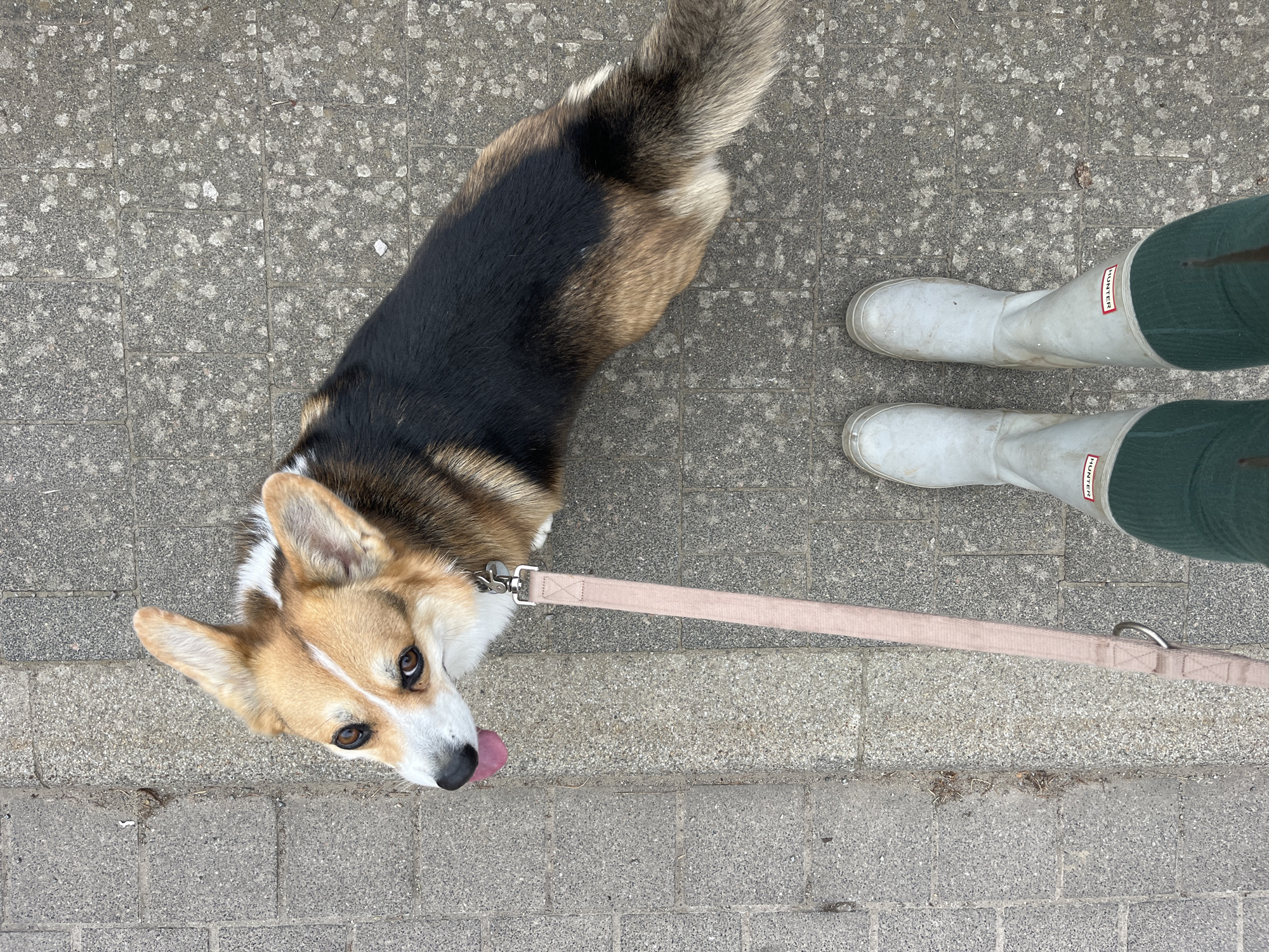A tri-color Pembroke Welsh Corgi, featuring tan, white, and black fur, is captured in an overhead view on a paved surface in Gangloff, Germany. The dog's head is tilted upward and slightly left, with its mouth open and a pink tongue exposed. It wears a metallic collar with a tag, attached to a light pink fabric leash extending towards the lower right. Directly in front of the dog are the lower legs and feet of a person, clad in dark green ribbed pants and white Hunter brand rubber boots. The ground consists of grey rectangular paving blocks, exhibiting irregular white discoloration and minor debris.
