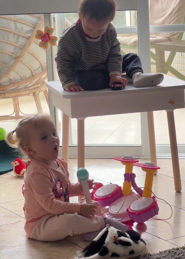 - "In an indoor, medium shot, a young girl plays a pink toy drum set with a microphone, while a young boy sits on a small table nearby, playing with a small toy car" by FM-Ve2st1, licensed under CC BY 4.0