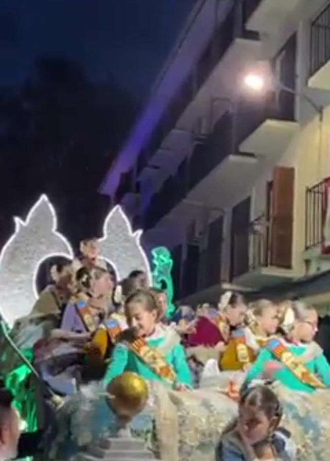 In a low-angle shot at night, a procession features a lavishly decorated float carrying several girls in traditional, colorful dresses and sashes. The float is adorned with glowing green accents, including a large, ornate backdrop and smaller decorative elements around the base. A large gold sphere sits in the center of the float. The girls are smiling and waving to the crowds. A man in a suit stands near the front of the float. In the background, there are buildings with balconies and a streetlight. The camera moves slightly, showing the float moving past. Then the view changes to a shot through the windshield of a car.