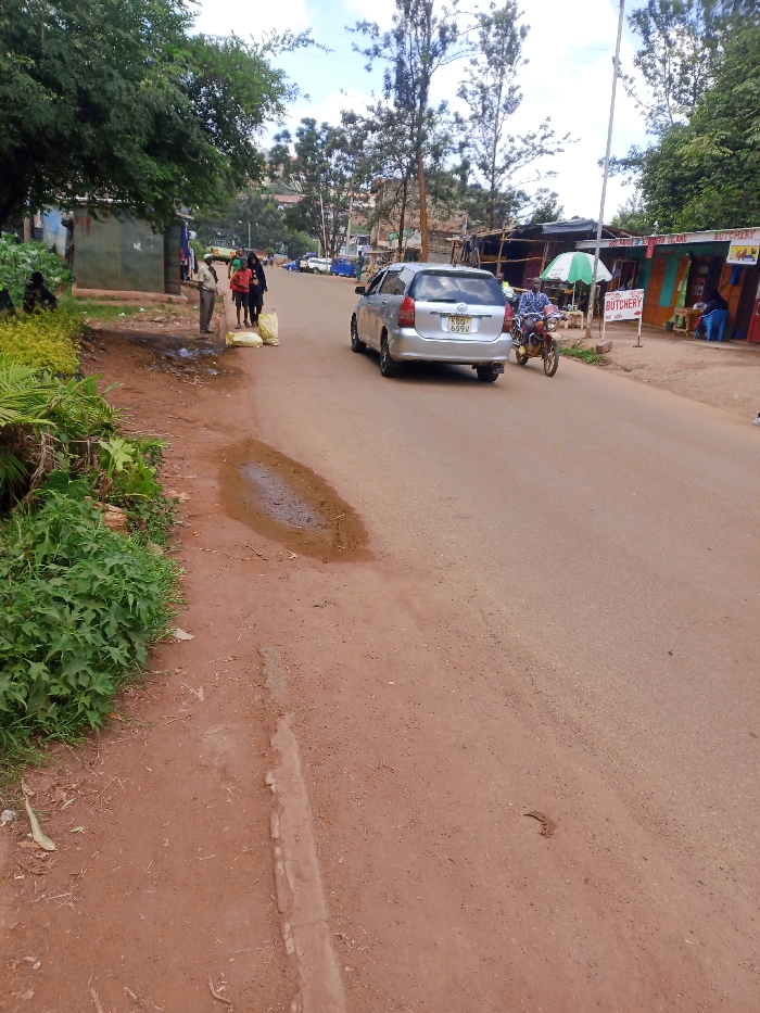 The image depicts a street scene in Murang'a, Kenya, under a partially cloudy daytime sky