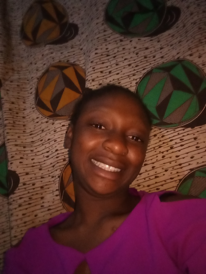A smiling woman with dark skin wears a purple top. The background features a patterned fabric with repeating circular designs, each segmented into triangles of varying colors including yellow, green, gray, and black. The overall lighting gives the image a warm tone, emphasizing the woman's smile and features. The focus is clearly on the woman's face, while the background provides a decorative but slightly distracting backdrop.