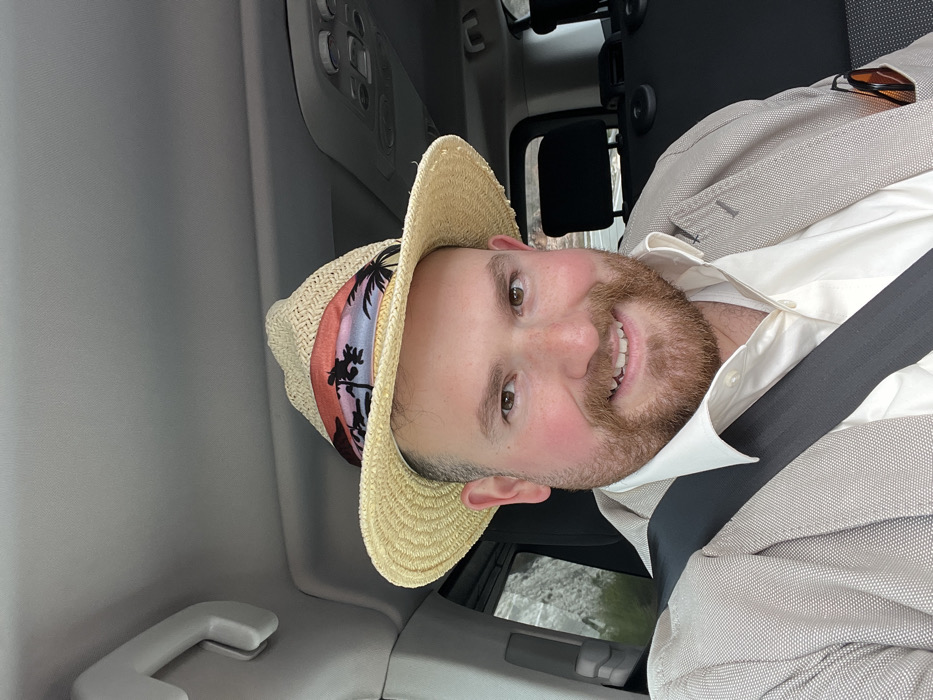 A male individual with a reddish-brown beard and mustache, fair skin, and brown eyes is depicted smiling directly at the viewer. He is seated in what appears to be the front passenger seat of a vehicle, secured by a black seatbelt across his chest. He wears a light-colored, possibly cream, collared shirt under a light beige or tan textured blazer. A pair of amber-lensed, tortoise-shell framed sunglasses are tucked into the blazer's breast pocket on the right side. The individual is wearing a straw fedora-style hat with a decorative band featuring a sunset gradient (orange, pink, blue) and black palm tree silhouettes. The vehicle's interior headliner is light grey, with a grey grab handle visible to the upper left and an overhead console with controls visible to the upper right. Through the vehicle's rear window on the left, a light-colored, rocky, mountainous landscape with sparse vegetation is visible, indicating the scene is located in Stanišići, Montenegro.