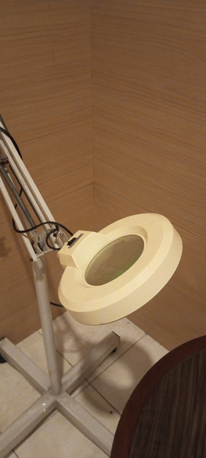The scene depicts an indoor environment in Pacet, Indonesia. A cream-colored, circular magnifying lamp is positioned on a white, articulated stand with visible springs and a black electrical cord. A black toggle switch is present on the top of the lamp head. The stand features a light grey X-shaped base resting on a light-colored tiled floor with dark grout lines. The background consists of light brown wood-paneled walls meeting at a corner. In the lower right foreground, a segment of a round, dark brown wooden table with a visible grain pattern is present. No individuals, direct actions, or interactions are observable in the image.