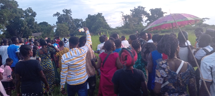 A large group of people gathers in a grassy field under a partly cloudy sky. Most face away from the viewer, with a few looking towards the camera. One man raises his phone to take a picture, while another holds a pink and purple umbrella above the crowd. Trees line the horizon in the background. People are dressed in casual attire.