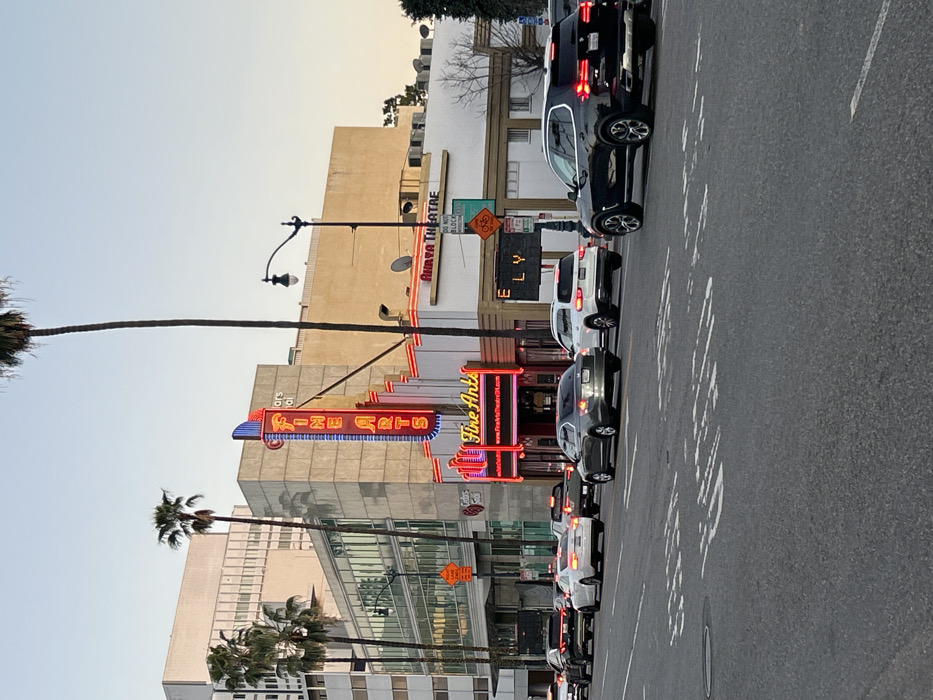 A street scene depicts two movie theaters, “Fine Arts” and “Ahaya Theatre”, both adorned with bright neon signs. Cars line the adjacent road, caught in traffic. Palm trees stand tall on the left, adding a Los Angeles vibe. The sky is a clear blue, suggesting a sunny day. The photo captures the lively atmosphere of an entertainment district.