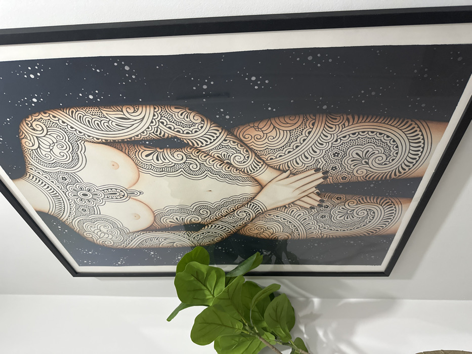 A large, vertically oriented framed artwork is mounted on a plain white wall in an indoor setting. The artwork depicts a headless, nude female figure from approximately the shoulders to the upper thighs, rendered with light skin tones. The figure is extensively covered in intricate, symmetrical black-line patterns resembling decorative tattoos or mehndi, distributed across the chest, arms, abdomen, and upper legs. The figure's hands are clasped together, fingers intertwined, positioned in front of the groin area, and exhibit black nail polish. The background within the artwork is a dark, deep blue or black field speckled with numerous small white dots, creating a celestial or cosmic effect. The artwork is enclosed within a thick, black frame, featuring a narrow white mat or border between the image and the frame. A reflective surface, likely glass or acrylic, covers the artwork. In the immediate foreground on the left, a portion of a green plant with large, glossy leaves is visible, partially obscuring the left side of the framed art. The overall scene's specific location within Madrid, Spain, cannot be determined from the visual evidence presented.