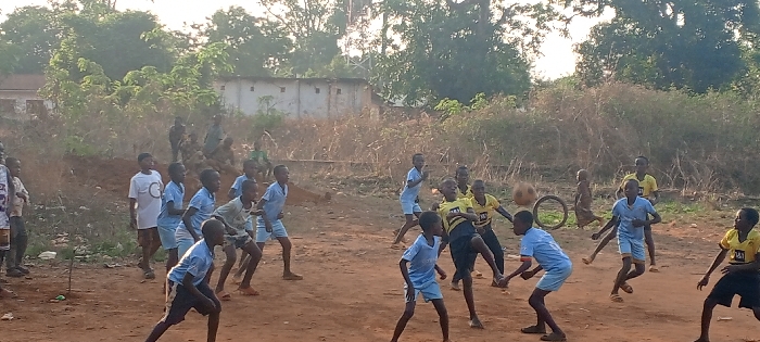 - "The image depicts an outdoor scene in Konongo, Democratic Republic of the Congo, featuring approximately 18-20 young males, primarily children or adolescents, engaged in a ball game on a reddish-brown dirt field" by FM-Di9s03, licensed under CC BY 4.0