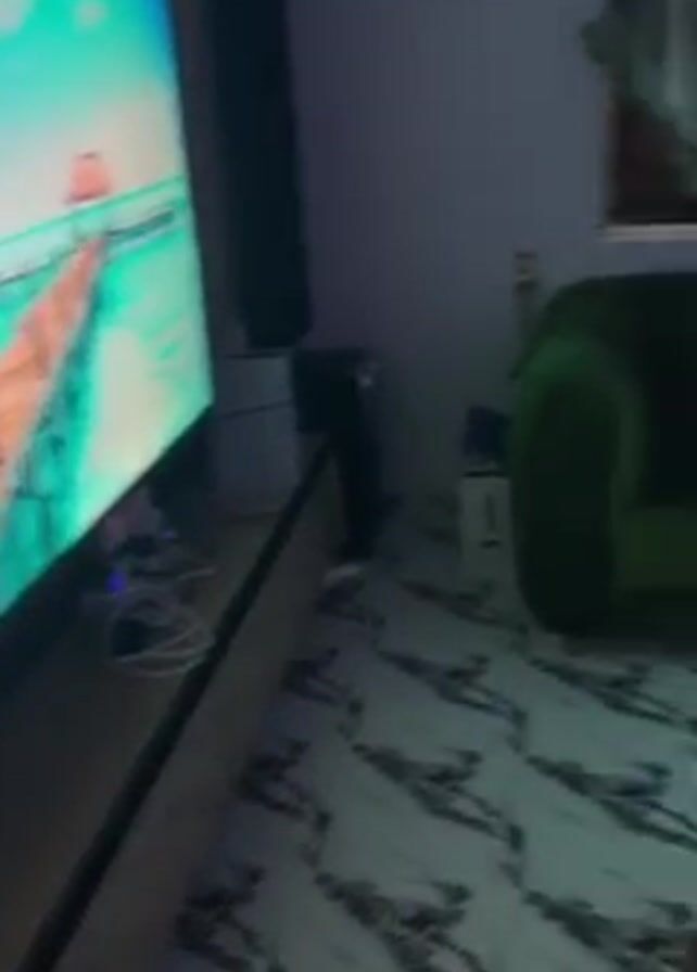 The video pans across a living room. There is a large television, a green velvet sofa, and a round coffee table. A shirtless man wearing a black beanie sits on the sofa and looks at his cell phone. The walls are painted light purple, and the floor is tiled with a marble-like pattern.