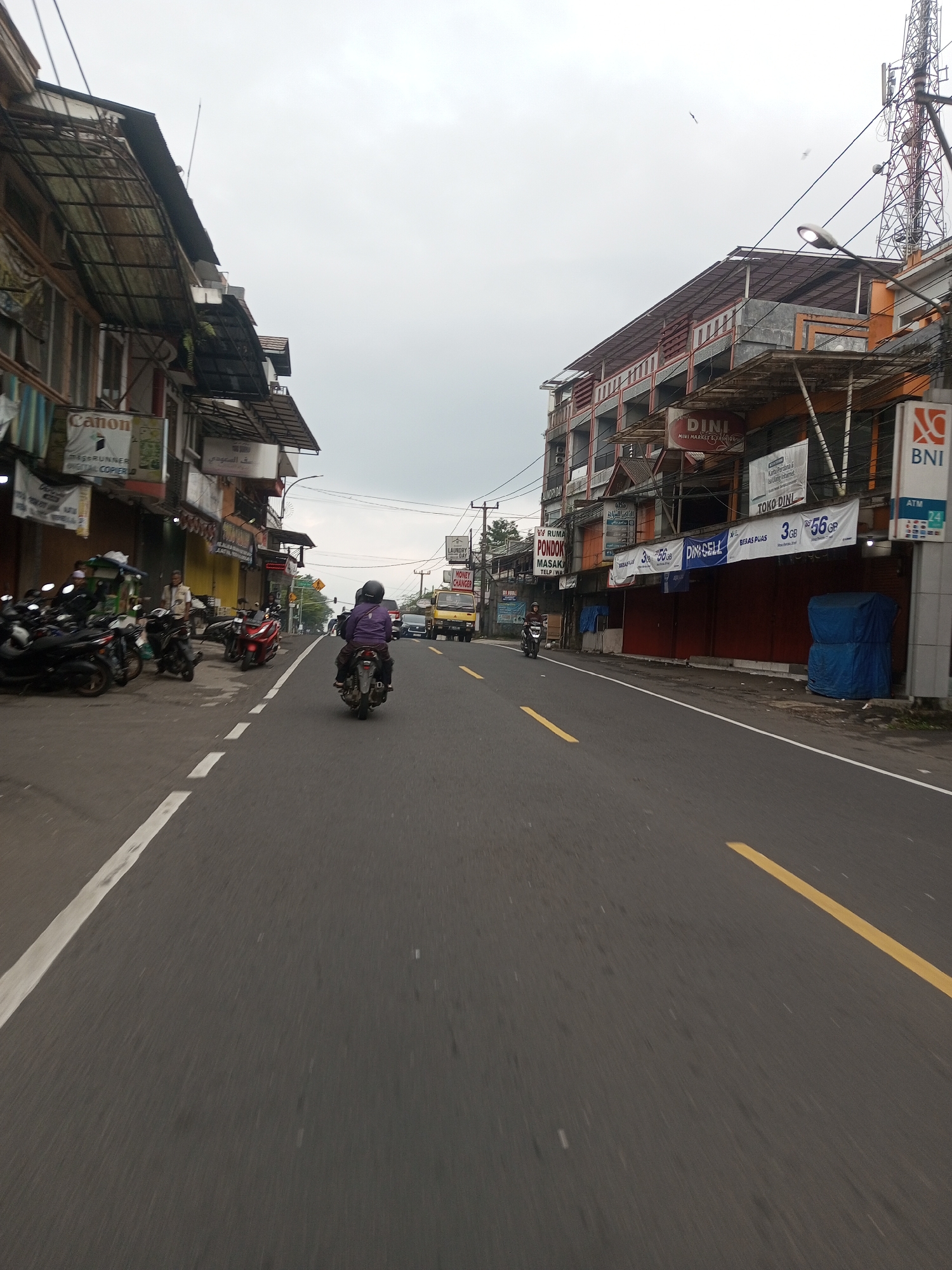 The image captures a street scene in what appears to be an urban or semi-urban area. A person on a motorbike is driving down the road, away from the camera. On either side of the road, there are buildings of varying heights, predominantly commercial, with signs and awnings. There are other parked motorbikes and shops visible along the roadside. The sky is overcast. Buildings have signs like "Canon", "LAUNDRY DAY MONEY CHANGER," "DINI MINI MARKET&KONGLO," and "BNI ATM". A yellow truck is seen in the distance. The road has a solid white line on one side and broken yellow lines. Overhead electrical or communication lines are visible. It is not possible to determine whether the location is in Taunggyi, Myanmar, as there are no identifying features that confirms that exact location.
