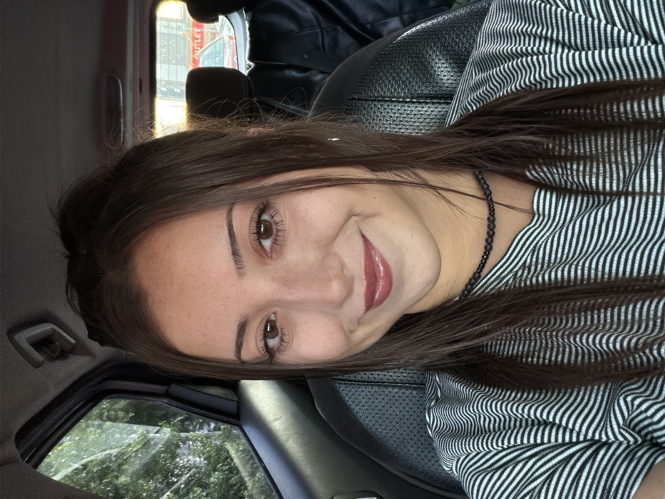 A young woman with brown hair smiles. She's wearing a black and white striped shirt and a beaded necklace. Her eyes are brown and she has light freckles. The photo is taken inside a car, with the car's interior and a glimpse of the outside visible in the background. The image is rotated counterclockwise.