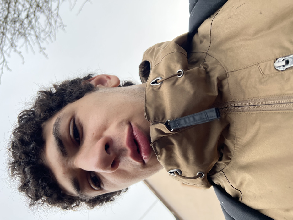This image depicts a close-up, low-angle self-portrait of a male individual outdoors in Meistratzheim, France. The subject, a young adult male with dark, curly hair and a light complexion, looks directly into the camera. His mouth is slightly open, and his gaze is direct. He wears a light brown or tan hooded jacket, partially zipped, revealing a silver-colored main zipper. A black rectangular pull tab is attached to the zipper. The hood features light brown drawstrings threaded through metallic grommets. A portion of a black strap, consistent with that of a backpack, is visible over his left shoulder. The background is largely an overcast, light gray sky. Faint, defoliated tree branches are discernible in the upper right background. A light-colored building is partially visible and blurred in the upper left background.