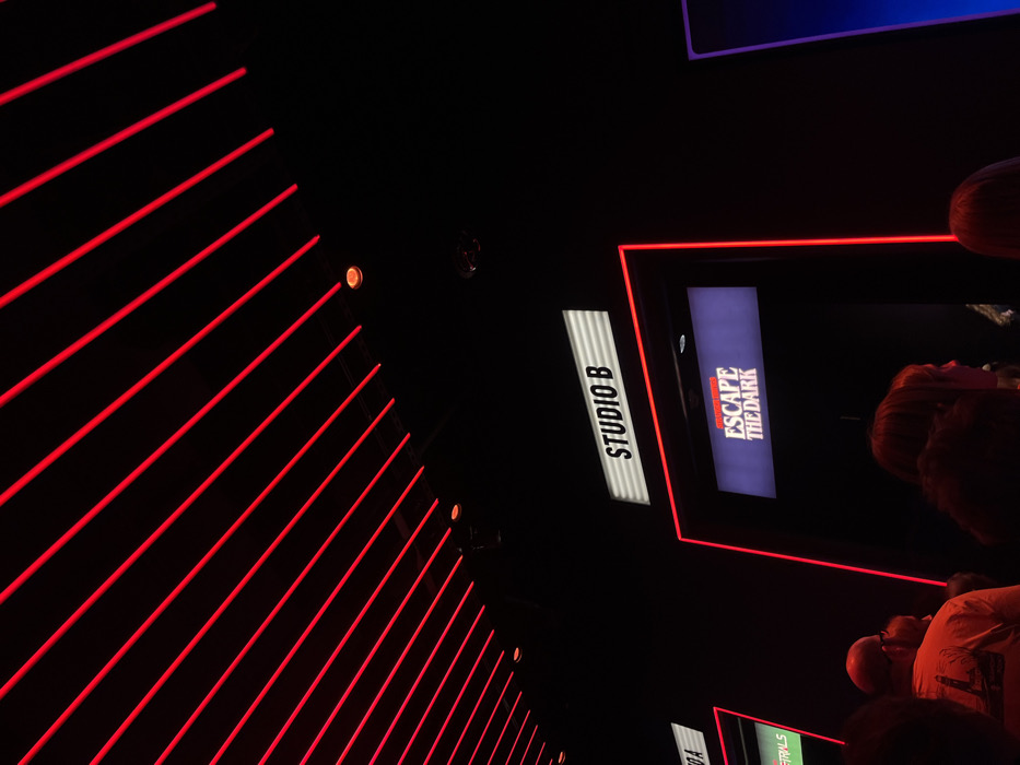 The image displays an interior hallway of the "Stranger Things: The Experience" installation, located at The Dallas Galleria, 13350 Dallas Pkwy, Dallas, TX 75240, United States. The environment is predominantly dark with black walls and ceiling. The ceiling features multiple parallel red neon-style light strips running diagonally across the upper portion of the frame, accompanied by recessed ceiling lights. In the mid-ground, a prominent illuminated sign reads "STUDIO B" in black letters on a white, horizontally ribbed panel. Below this sign, a doorway is outlined by a vertical red neon-style strip. Above the doorway, a rectangular screen displays "STRANGER THINGS" in red text and "ESCAPE THE DARK" in white text against a dark purple background, indicating the theme of an interactive experience. To the immediate left, a portion of an adjacent entrance sign, "STUDIO A," is visible, along with the partial word "SPECTRAL[S]." In the foreground, several individuals are present, observed from behind, appearing to be queuing or standing in a waiting area. One male individual in the lower left foreground wears a light-colored short-sleeved shirt with a graphic on the back. No specific actions or interactions are discernible among the individuals beyond their static presence.