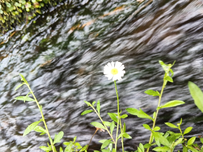 The image displays a close-up, ground-level view of a natural environment in Unknown, Vietnam. The central subject is a single white flower, consistent with a daisy, featuring a bright yellow center, positioned on a slender green stem and standing against a water background. In the foreground, several green leafy plants with thin stems are visible, some leaves bearing visible moisture. The background consists of dark, flowing water exhibiting pronounced ripples and streaks, suggesting movement and shallow depth. The water surface reflects muted tones of grey, black, and earthy brown. Blurred green foliage is present in the upper left section of the frame. No human individuals, animals, or artificial structures are present. The scene is static, captured under diffused natural lighting conditions.