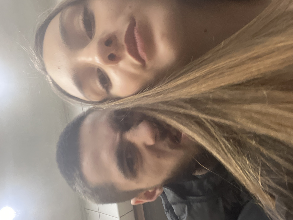 The image depicts two young adult individuals in a close-up, low-angle selfie perspective within a dimly lit indoor environment. The subject on the right, a female, occupies the foreground, with her long, light brown hair extending across the lower left portion of the frame, partially obscuring the male subject. Her face is angled slightly upwards, and her expression is largely neutral, with lips slightly parted. Her right shoulder and a portion of her chest are visible, suggesting a light-colored garment underneath her hair. The subject on the left, a male, is partially visible behind and to the left of the female. He has short, dark hair and visible facial stubble. He displays an exaggerated facial expression, characterized by furrowed brows, a wrinkled nose, and an open mouth, conveying a playful grimace. He is dressed in a dark, possibly black, padded jacket. The background is indistinct and appears to be an interior space. White rectangular wall tiles with dark grout lines are visible on the upper left, suggesting a utility area such as a kitchen or bathroom. Overhead, a light source casts a bright reflection on the ceiling. The specific location within the city of Sofia, Bulgaria, cannot be determined from the visual evidence present in the image.