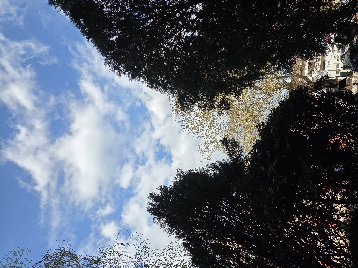 The scene presents an upward-angled view of a bright blue sky populated by scattered white cumulus clouds, indicating daytime. Dominating the lower and side portions of the frame are heavily shadowed, dense tree canopies, primarily dark green or black in appearance due to backlighting or shade. Centrally, a deciduous tree with light green or yellowish spring foliage is visible, appearing brighter than the surrounding dark trees. Through gaps in the lower-right foliage, sections of a multi-story, light-colored urban building with visible balconies are discernible. Below the building, an urban street or paved area is visible, containing a light-colored parked vehicle and at least two indistinct human figures, one appearing to wear dark clothing. The setting is an urban environment within the city of Gevgelija, North Macedonia.