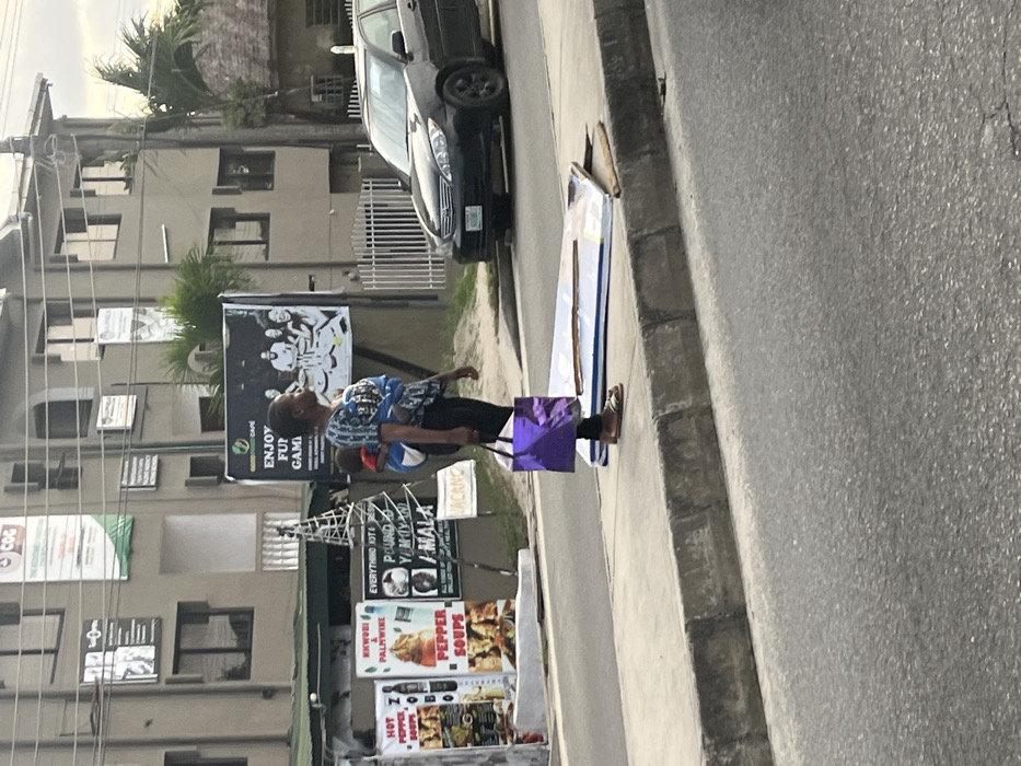 An adult female stands on a concrete sidewalk in Badore, Nigeria, facing right