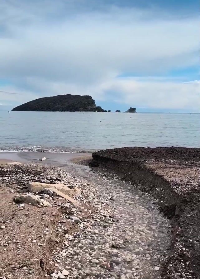 view from a beach looking out towards a body of water. A small stream of clear water flows through a pebble-filled channel toward the water. The beach consists of sand, pebbles, and darker patches of soil. In the distance, an island is visible, dark in color and topped with greenery. The sky is light blue with fluffy white clouds. The water is calm and still. There are no people visible in the video.