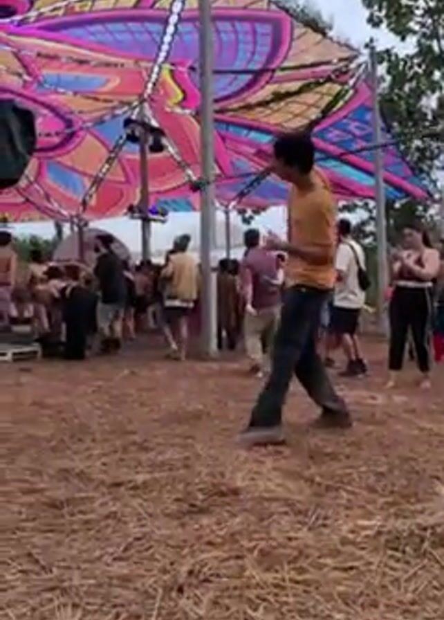crowd of people dancing under a large, colorful canopy supported by metal posts. The canopy has an intricate geometric design featuring vibrant shades of pink, blue, and yellow. A man in a yellow shirt and dark pants is energetically dancing in the foreground, raising his arms and moving rhythmically. Other people are seen scattered around, some dancing, some walking, and some standing still. A large black speaker sits near the edge of the canopy. The ground is covered in straw or wood chips, and trees are visible in the background, indicating an outdoor setting. The sky appears overcast.