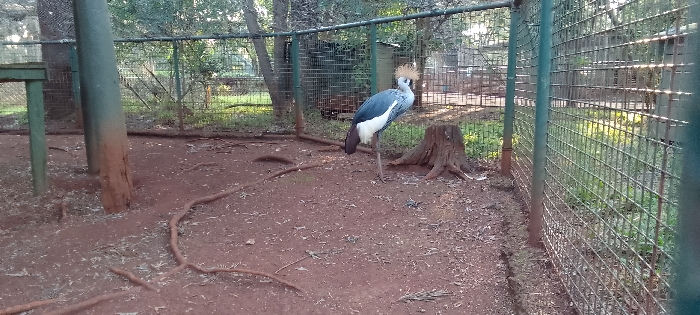 The image depicts a single Grey Crowned Crane (Balearica regulorum) within an outdoor enclosure located in Athi River ward, Kenya