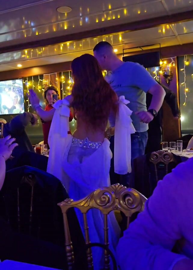 man and a woman belly dancing in what appears to be a restaurant setting. The woman has long red hair and is wearing a white, sparkly outfit with flowing white fabric attached to her arms. The man is wearing a blue t-shirt and jeans, and is holding onto the woman's waist as they dance. They are surrounded by tables with guests. The lighting is dim with string lights and colored lights highlighting the scene. Other people can be seen in the background, some observing and others taking pictures. The restaurant seems decorated with a gold trim and the chairs have gold detailing. There is a TV on in the background showing a video.