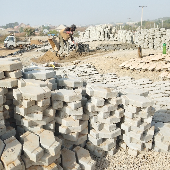 The image depicts an outdoor construction material manufacturing or storage site, likely located in Jos, Nigeria