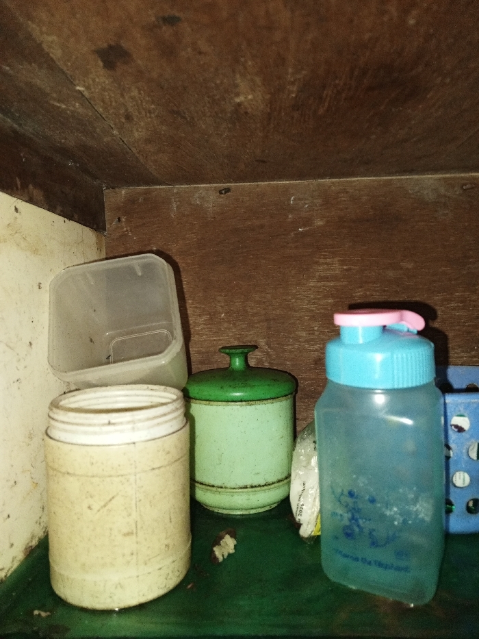 The image captures a static, close-up view inside a dusty storage compartment or shelf. The location is an interior space in Dugoan, Philippines. The compartment features a dark brown wooden back wall and ceiling, showing visible wood grain, dust accumulation, and some dark stains or marks. The bottom surface is a dark green shelf, also covered with dust and scattered debris. An off-white or light-colored vertical surface is visible on the left side of the frame. From left to right, the objects present on the green shelf are: 1. A cylindrical, off-white, opaque plastic jar, open with visible screw threads at the top, indicating the absence of a lid. It appears worn and soiled. 2. Behind and slightly above the open jar, a translucent, rectangular plastic container is positioned vertically, open, and leaning against the back wall. It contains minor residue or dust. 3. A light green cylindrical container with a darker green lid, topped with a small knob. The container's surface is speckled with dust or minor discoloration. 4. A crumpled white plastic bag, partially visible, located between the green container and the water bottle. The text "2026" is partially legible on the bag. 5. A translucent blue plastic water bottle with a light blue screw-on cap and a pink flip-top spout. The bottle exhibits internal white specks or residue and has faded blue graphics, including "mama The Elephant". 6. A segment of a blue plastic basket with circular perforations is visible to the right of and behind the water bottle. No individuals are present. No explicit actions or interactions are depicted. The scene is characterized by utilitarian storage items in a state of disuse or disarray.