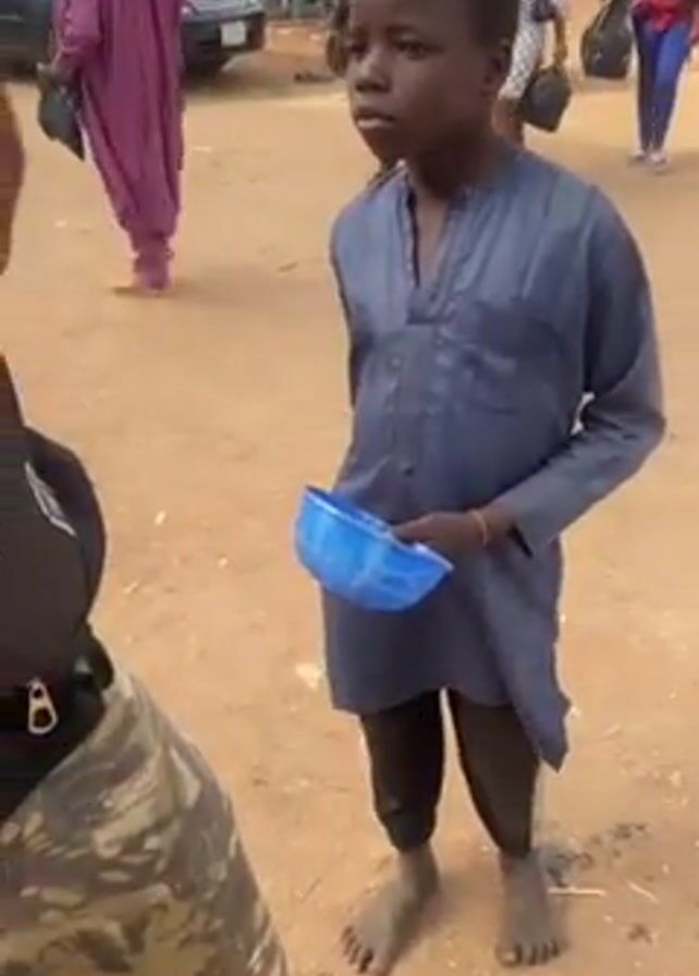 barefoot young boy with dark skin, standing on a dusty ground, wearing a blue, buttoned shirt and dark pants. He holds a small blue bowl in his left hand and looks toward the person holding the camera. People walk in the background, some are wearing dresses, others are wearing traditional clothing. A car is visible in the background as well as a cart. A person wearing camouflage clothing is standing on the left of the frame.