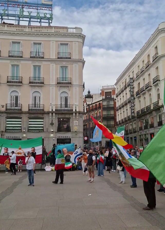 demonstration occurring in a European city square. There is a crowd of people holding various flags including the Iranian flag, Spanish flag and other foreign national flags. Many of them are clustered around a man speaking at a microphone. Banners with photos of people are present. The square is paved with patterned stones. Buildings line the perimeter of the square. Overhead is a slightly cloudy sky.