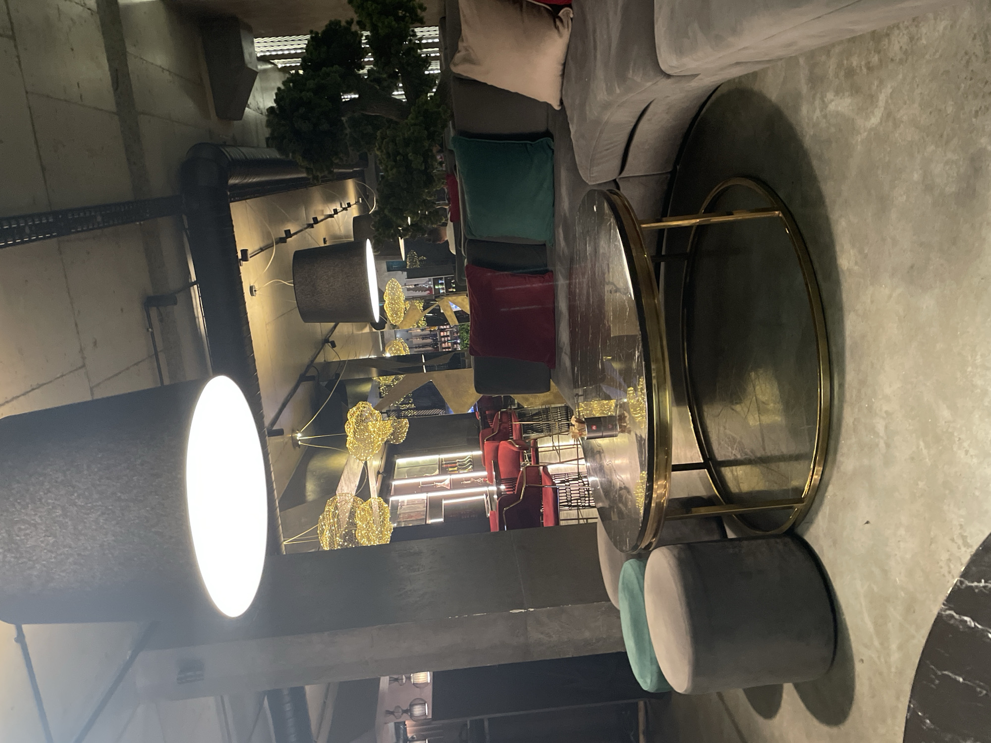 interior of a restaurant. There is a grey velvet sofa with various pillows on it (beige, green, and red). In front of the sofa is a round coffee table with a golden frame. Several small, round stools are next to the table. Overhead, there are decorative lamps with golden, spherical ornaments and a large cylindrical lamp providing illumination. The background shows a reflection in the glass table, indicating the presence of red chairs, tables, and decorative items. The overall impression is of a modern and stylish interior. The city where the photo was taken is Stara Zagora, Bulgaria.