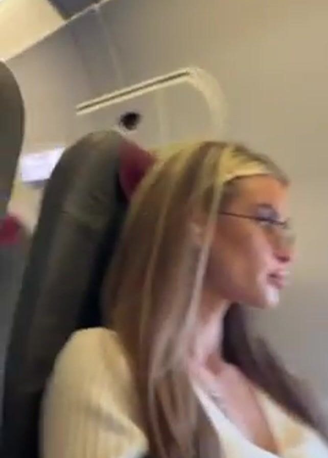 A woman with long blonde hair and glasses is seated on an airplane, looking out the window