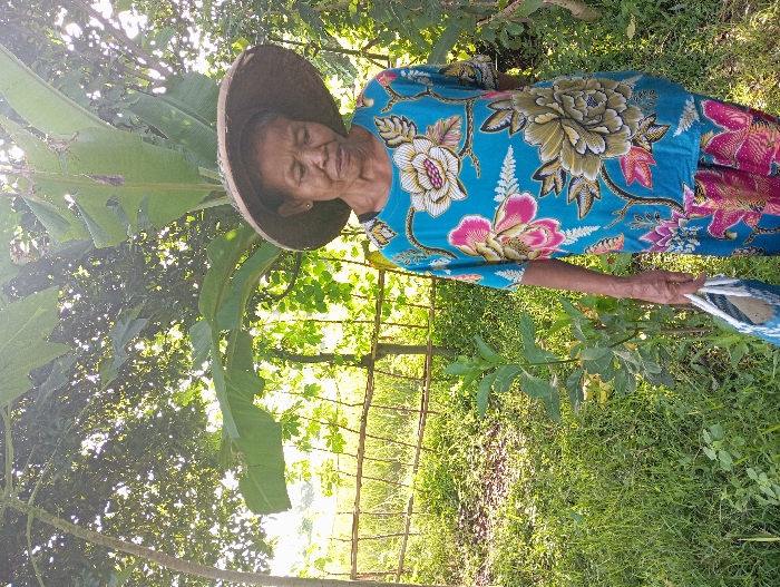 A female individual, appearing elderly, stands outdoors in a densely vegetated area identified as Waung, Indonesia