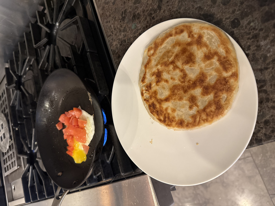 A forensic description of the scene in Cresskill, United States: The image depicts a cooking scene within a kitchen. In the midground, a black frying pan rests on a professional-grade gas stovetop with black cast-iron grates. Inside the pan, one partially cooked egg with a distinct bright yellow yolk and set white is accompanied by a pile of diced red tomatoes. A blue flame is visible beneath the pan, indicating an active gas burner. To the right, on a dark, mottled countertop, a white, round ceramic plate holds a single, golden-brown, circular flatbread with a textured, layered surface, consistent with a paratha. A section of light-colored tiled flooring is visible in the lower left corner. No individuals are present in the frame.