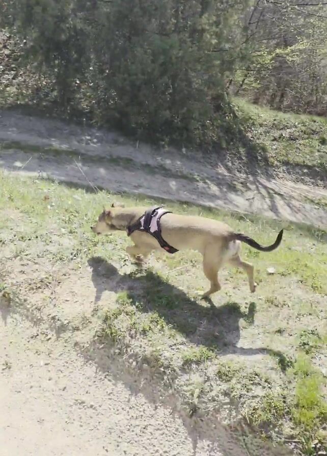 A dog wearing a pink harness is seen walking on a path made of sand and dirt. The path is surrounded by patches of green grass and a wooded area in the background. The dog moves from left to right, casting a shadow on the ground. The day appears to be sunny, based on the shadows and light. The dog's tail is slightly raised as it walks.