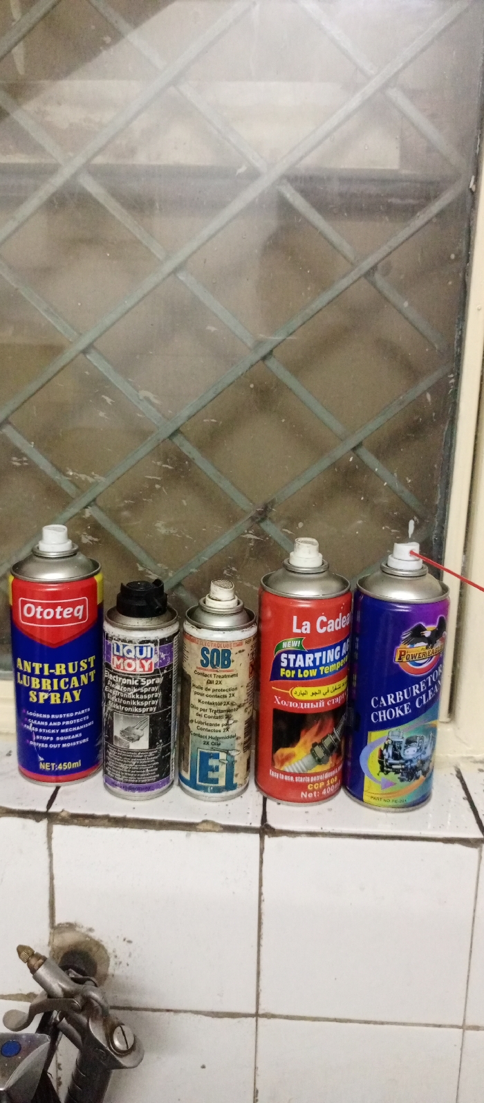 The image displays five different aerosol cans lined up on a tiled surface, likely near a window with a patterned grid